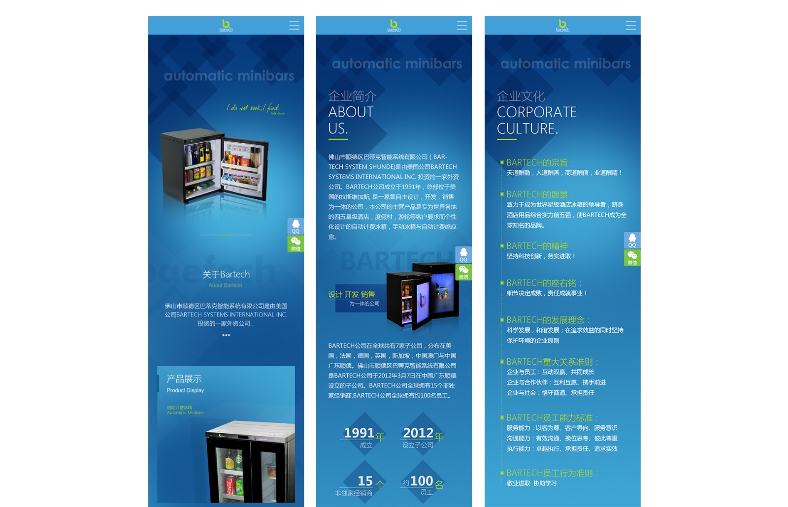 佛山市順德區巴蒂克智能系統有限公司(BARTECH SYSTEM SHUNDE)是由美國公司BARTECH SYSTEMS INTERNATIONAL INC. 投資的一家外資公司。BARTECH公司成立于1991年,總部位于美國的拉斯維加斯, 是一家集自主設計,開發,銷售為一體的公司,本公司的主營產品是專為世界各地的四五星級酒店,度假村,游輪等客戶要求而個性化設計的自動計費冰箱,手動冰箱與自動計費感應盒。